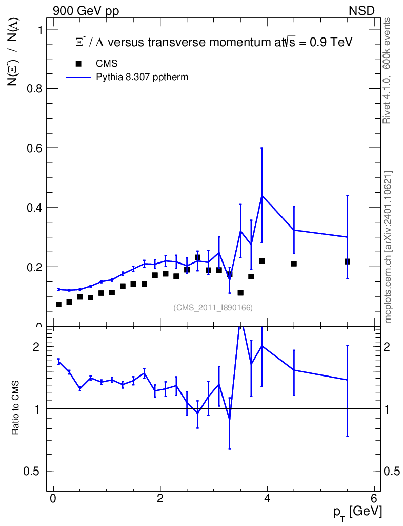 Lines: data, pythia8 8.307 pptherm |