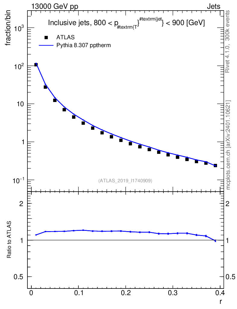 Lines: data, pythia8 8.307 pptherm |