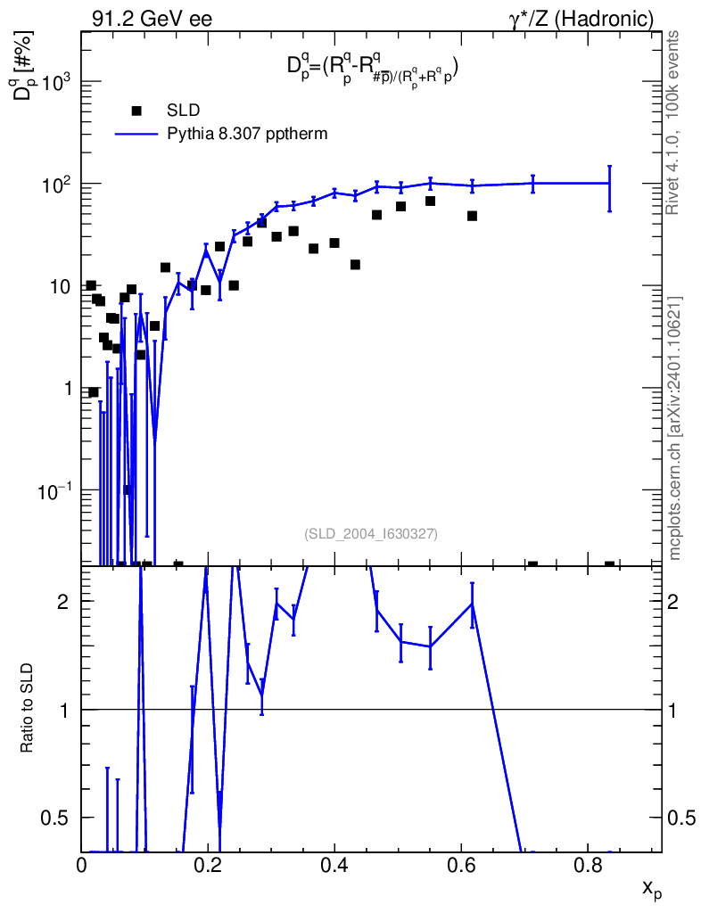 Lines: data, pythia8 8.307 pptherm |
