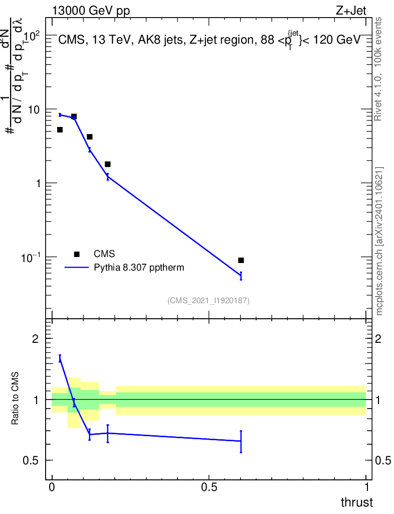 Lines: data, pythia8 8.307 pptherm |