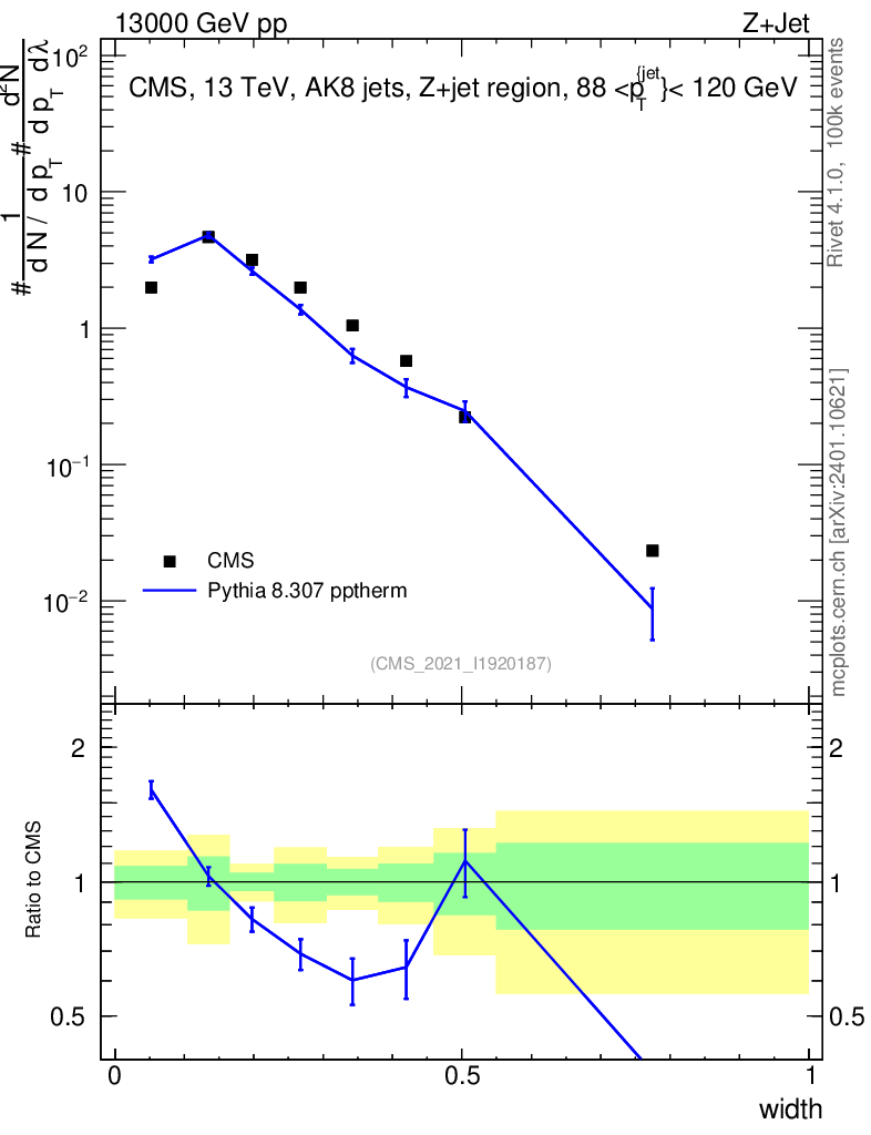 Lines: data, pythia8 8.307 pptherm |