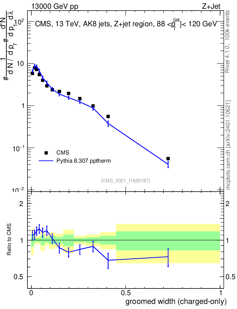 Lines: data, pythia8 8.307 pptherm |