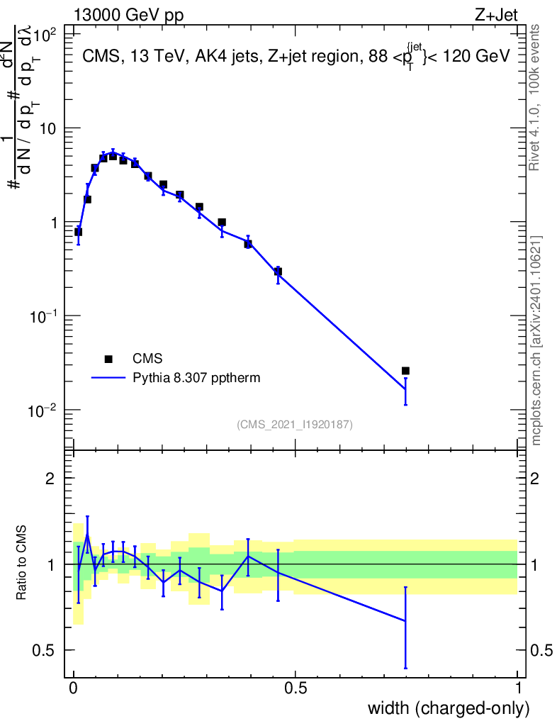 Lines: data, pythia8 8.307 pptherm |