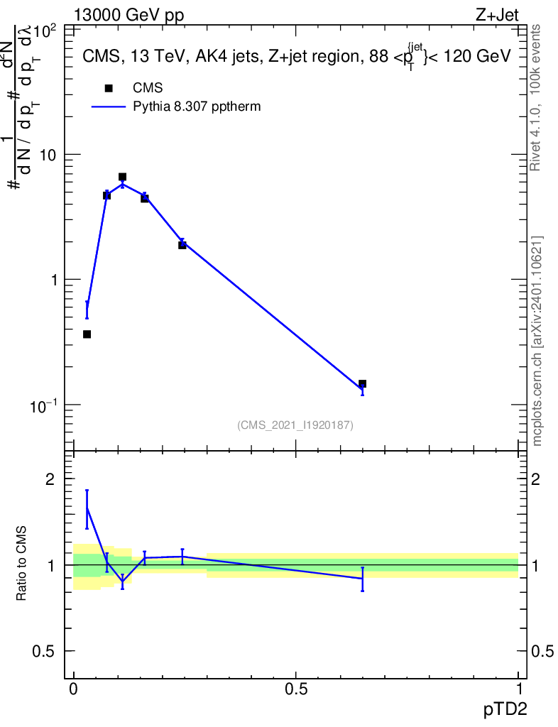 Lines: data, pythia8 8.307 pptherm |