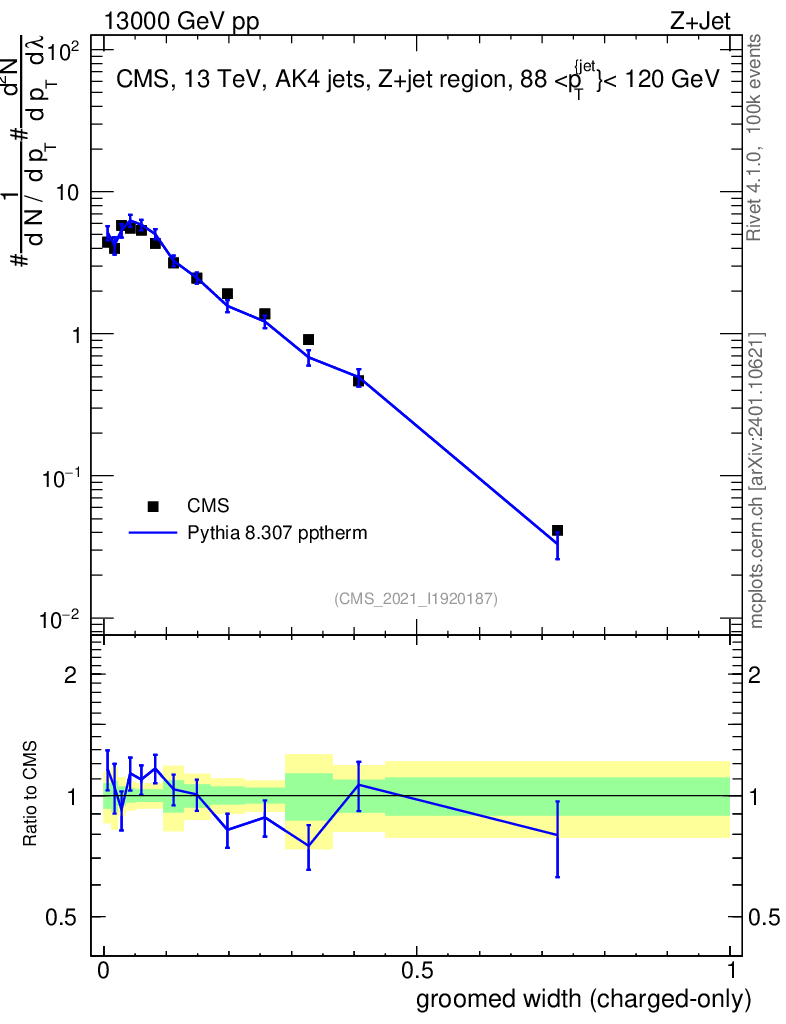 Lines: data, pythia8 8.307 pptherm |