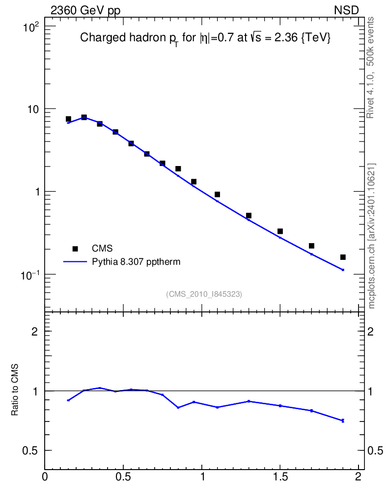 Lines: data, pythia8 8.307 pptherm |