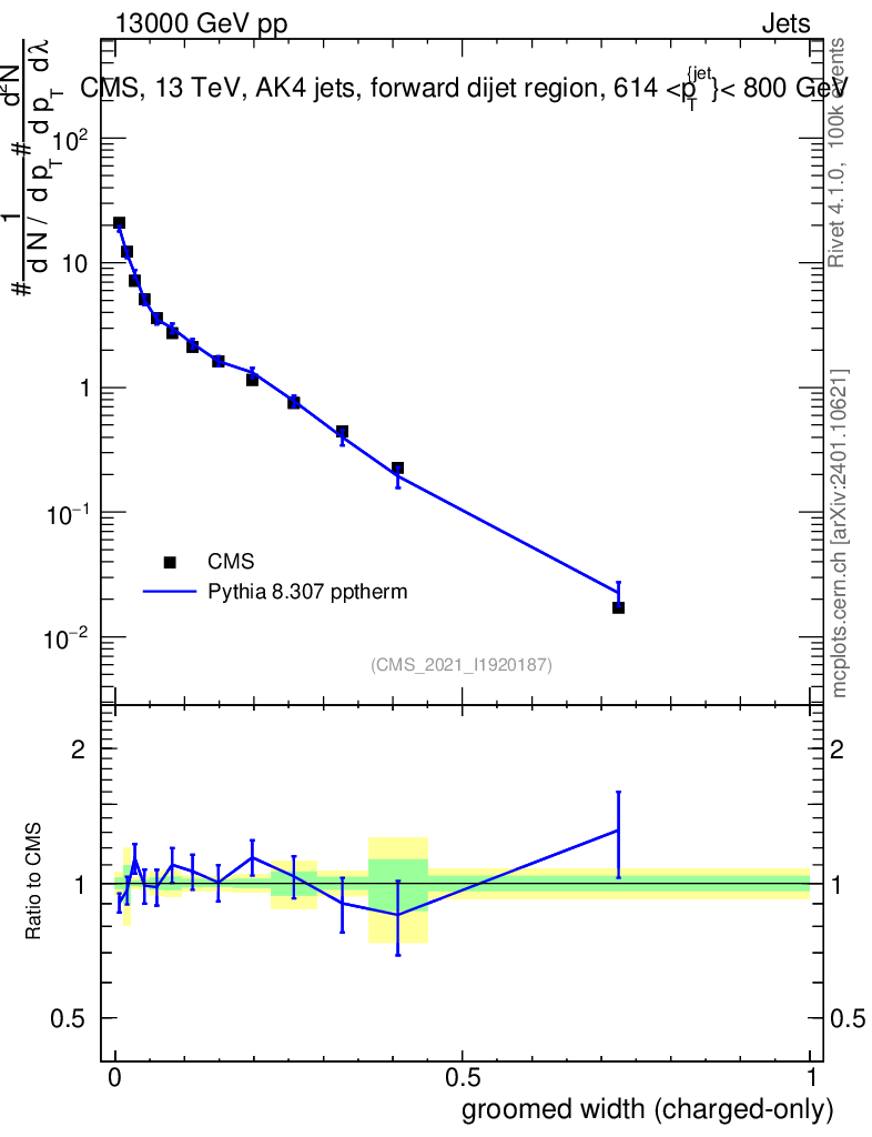 Lines: data, pythia8 8.307 pptherm |