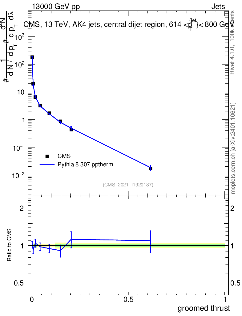 Lines: data, pythia8 8.307 pptherm |