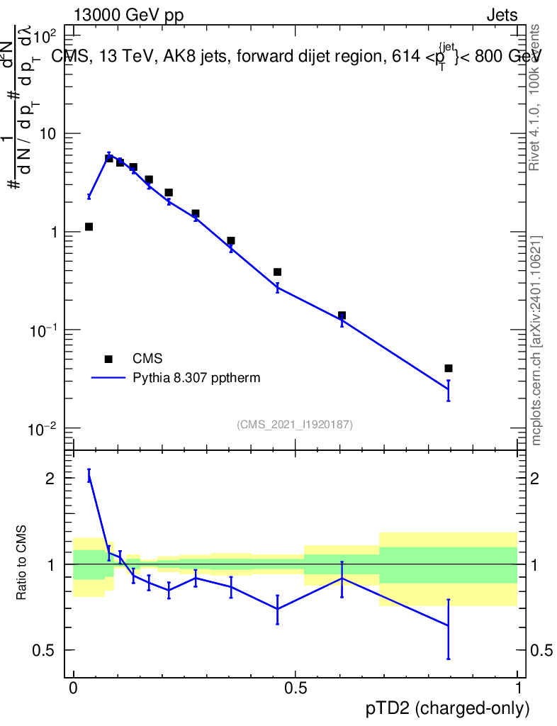 Lines: data, pythia8 8.307 pptherm |
