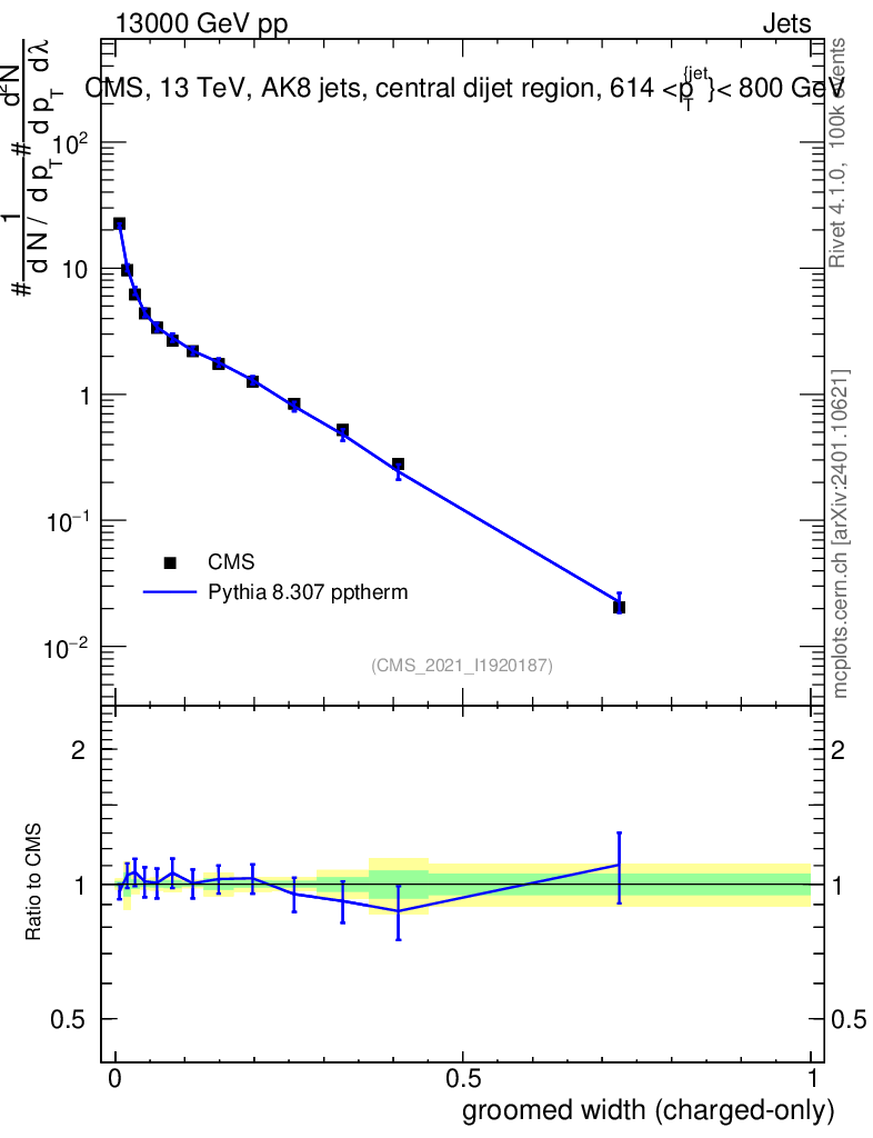 Lines: data, pythia8 8.307 pptherm |