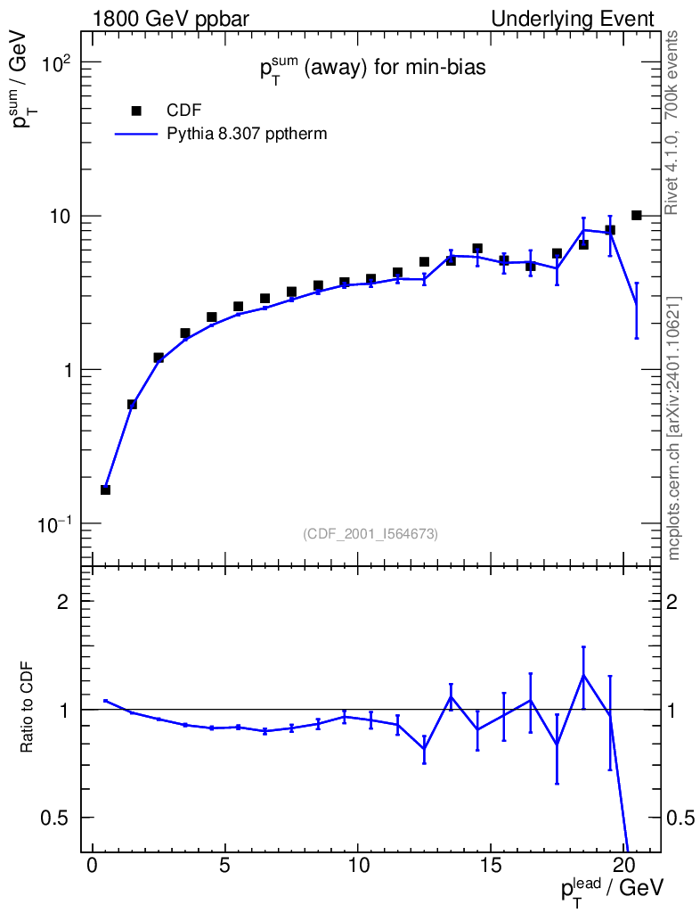 Lines: data, pythia8 8.307 pptherm |