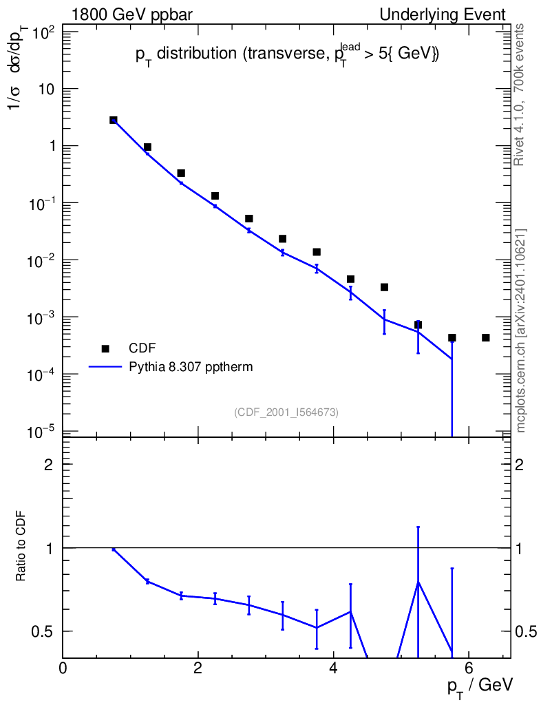 Lines: data, pythia8 8.307 pptherm |