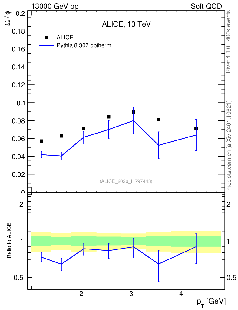 Lines: data, pythia8 8.307 pptherm |