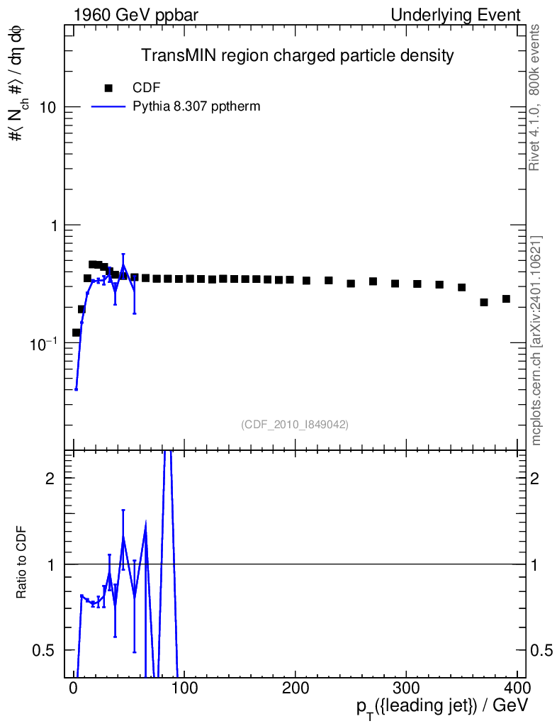 Lines: data, pythia8 8.307 pptherm |