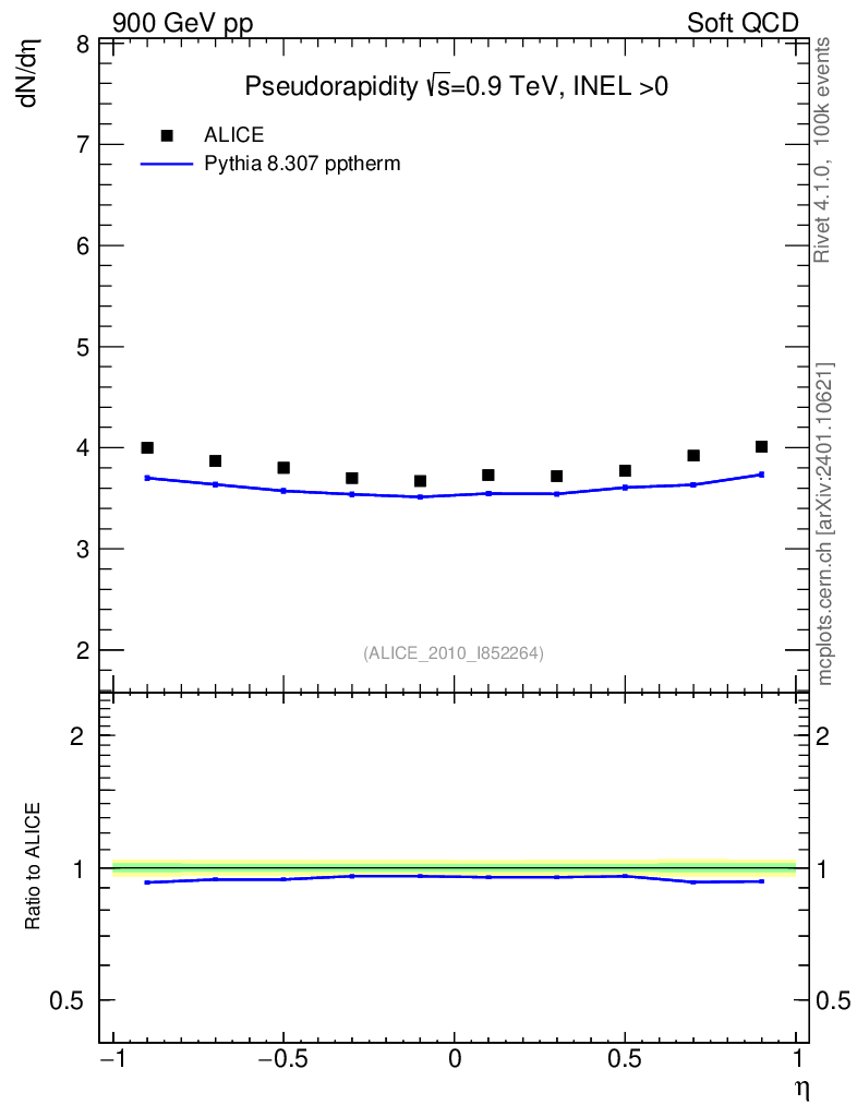 Lines: data, pythia8 8.307 pptherm |