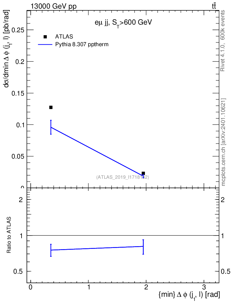 Lines: data, pythia8 8.307 pptherm |