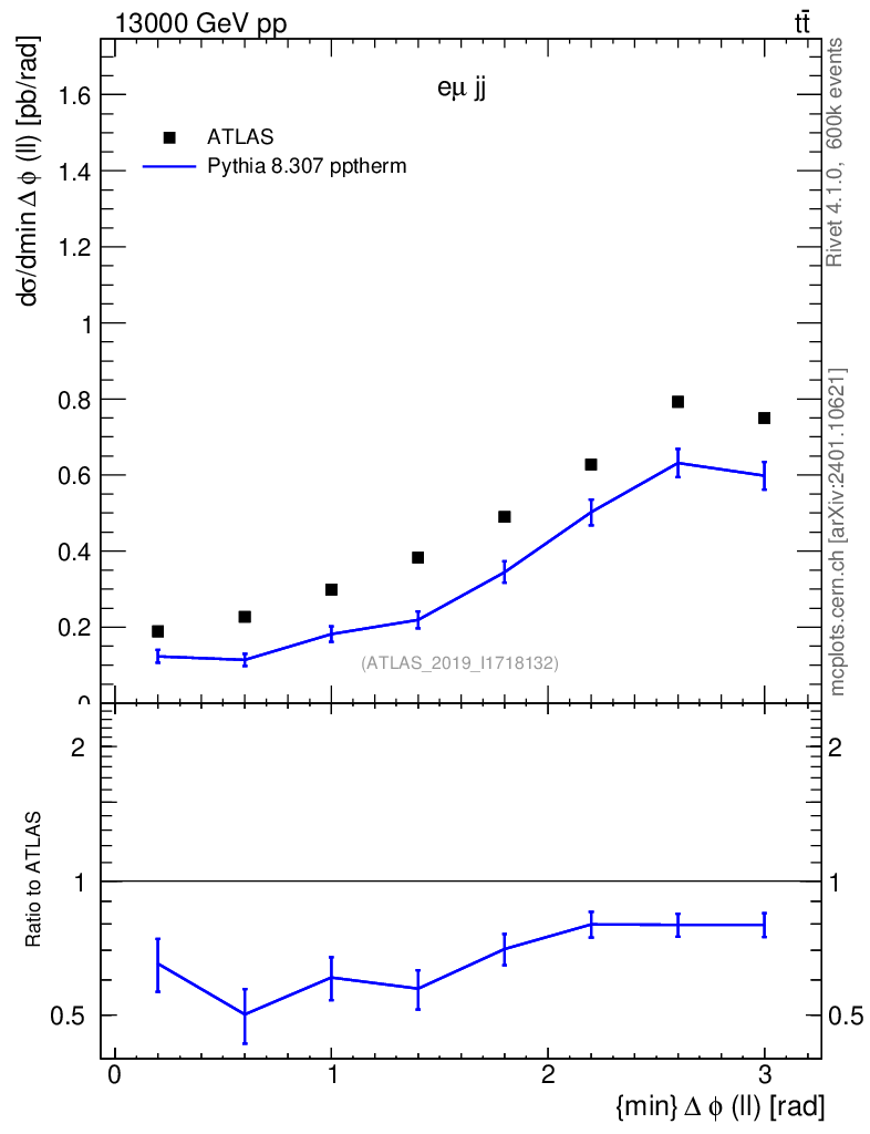 Lines: data, pythia8 8.307 pptherm |