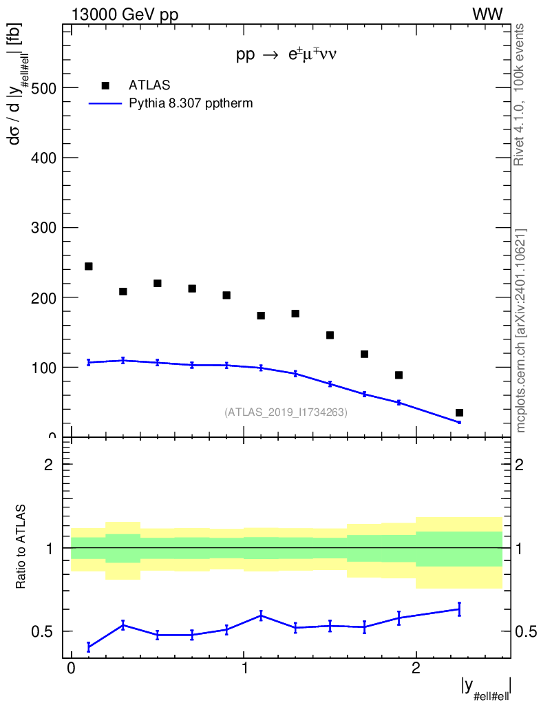 Lines: data, pythia8 8.307 pptherm |