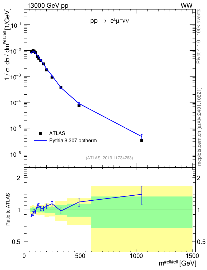 Lines: data, pythia8 8.307 pptherm |