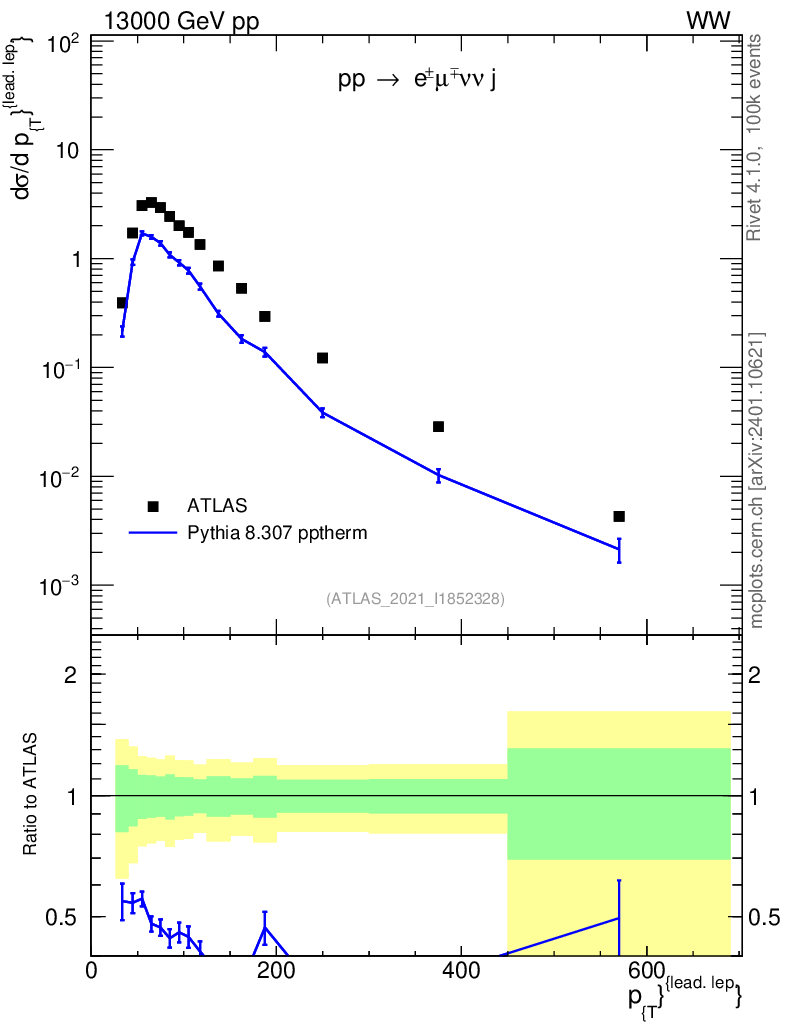 Lines: data, pythia8 8.307 pptherm |