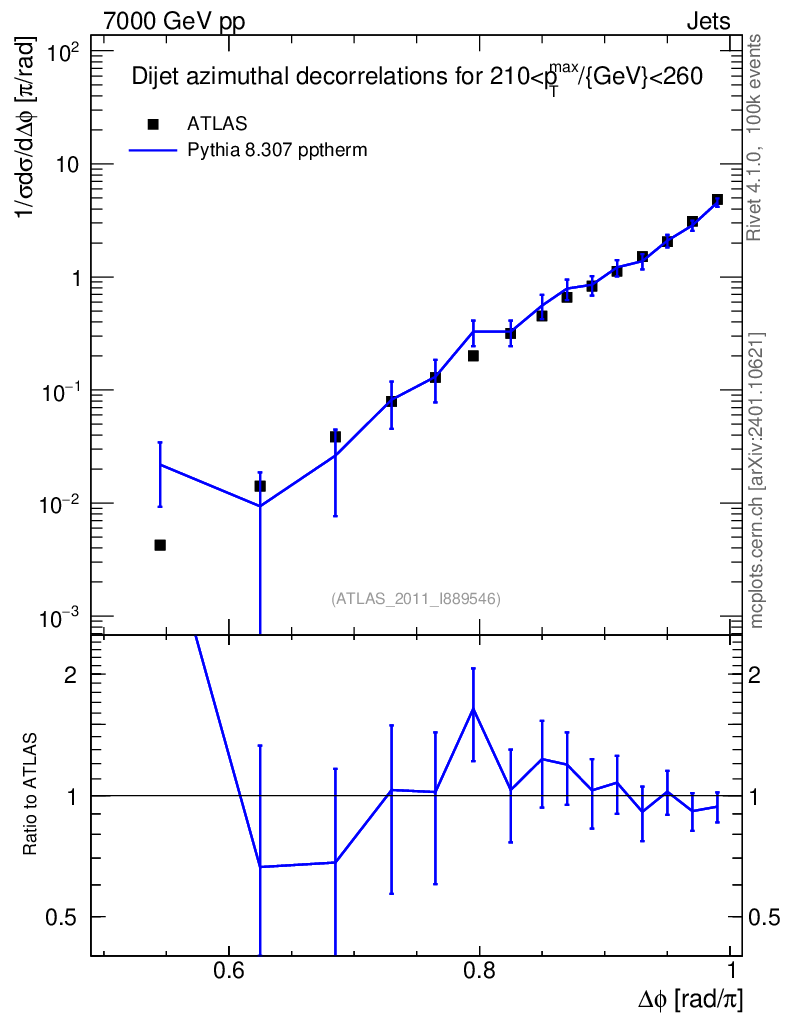 Lines: data, pythia8 8.307 pptherm |