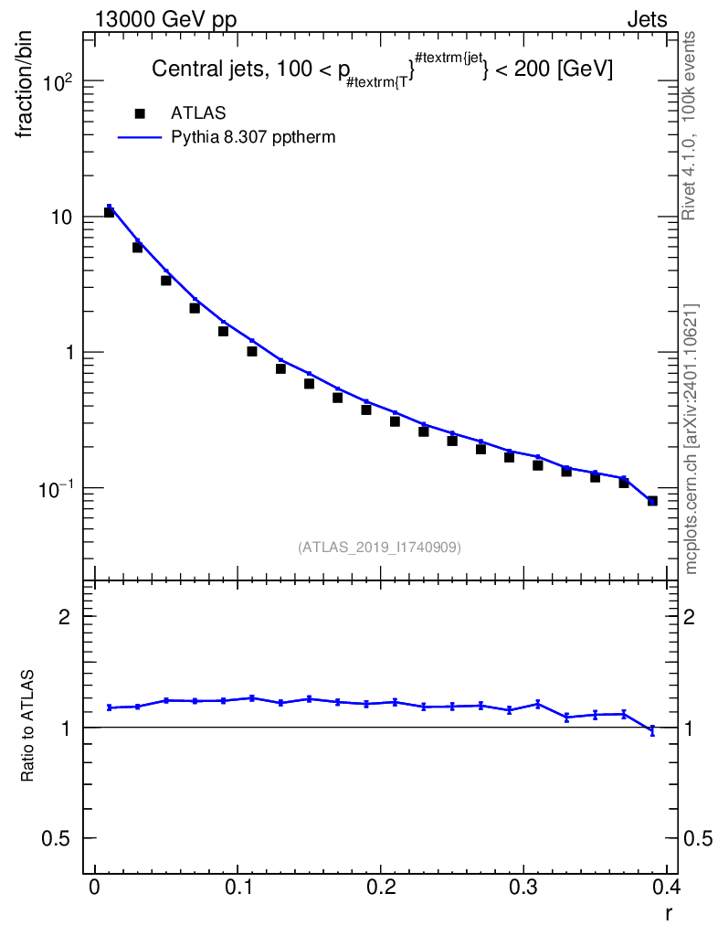 Lines: data, pythia8 8.307 pptherm |