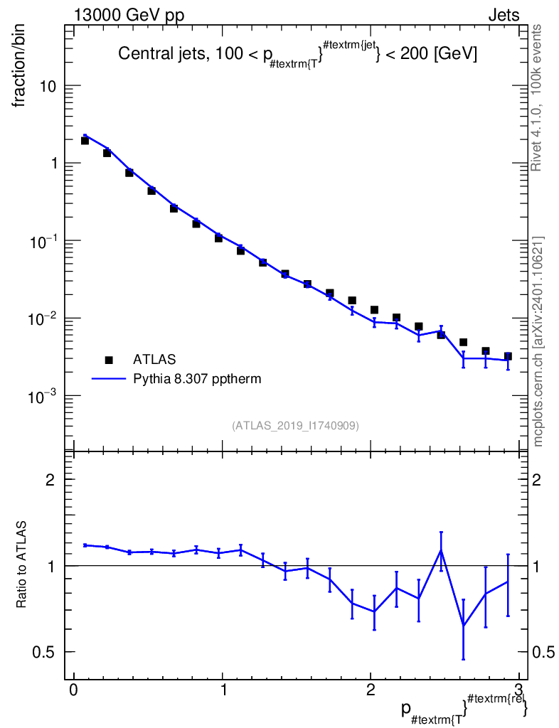 Lines: data, pythia8 8.307 pptherm |