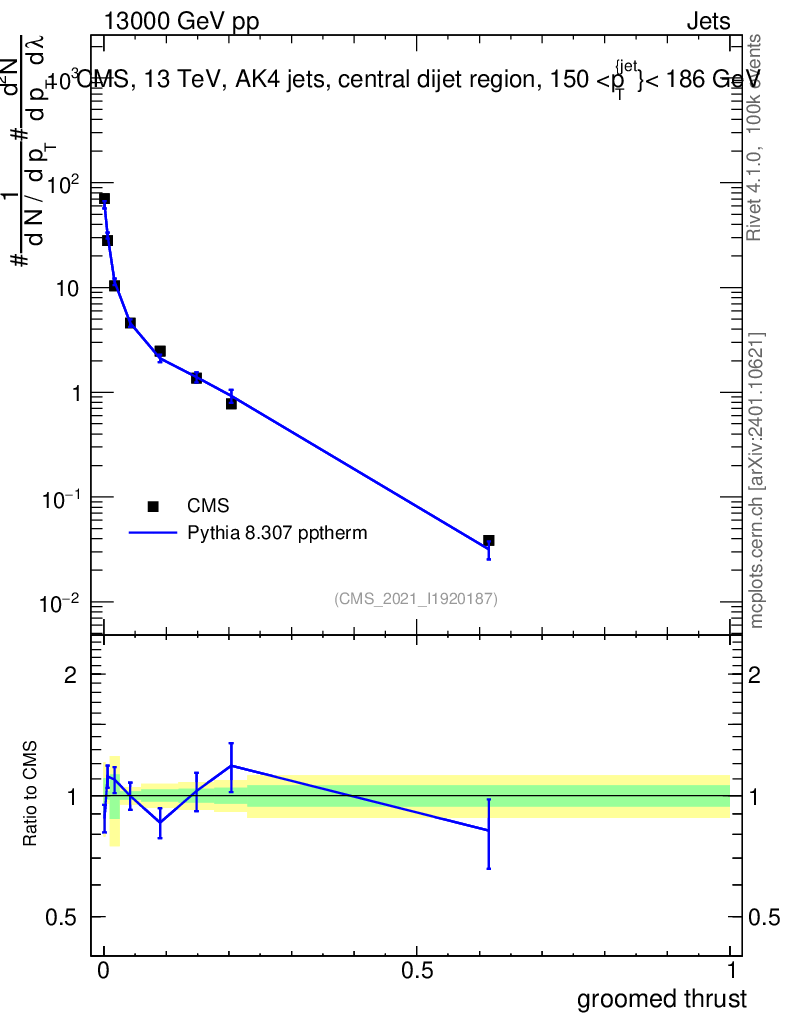 Lines: data, pythia8 8.307 pptherm |