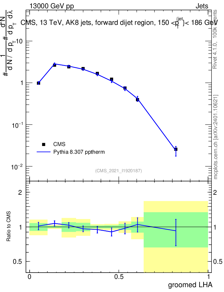 Lines: data, pythia8 8.307 pptherm |