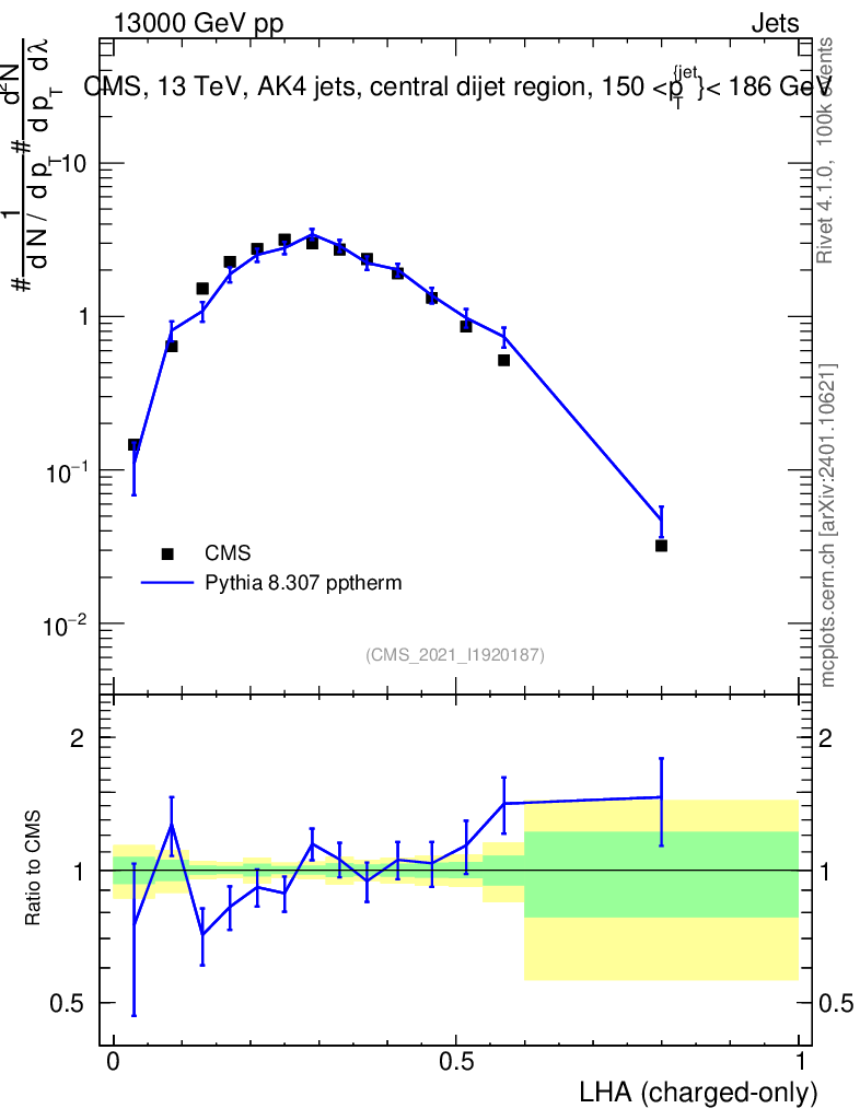Lines: data, pythia8 8.307 pptherm |