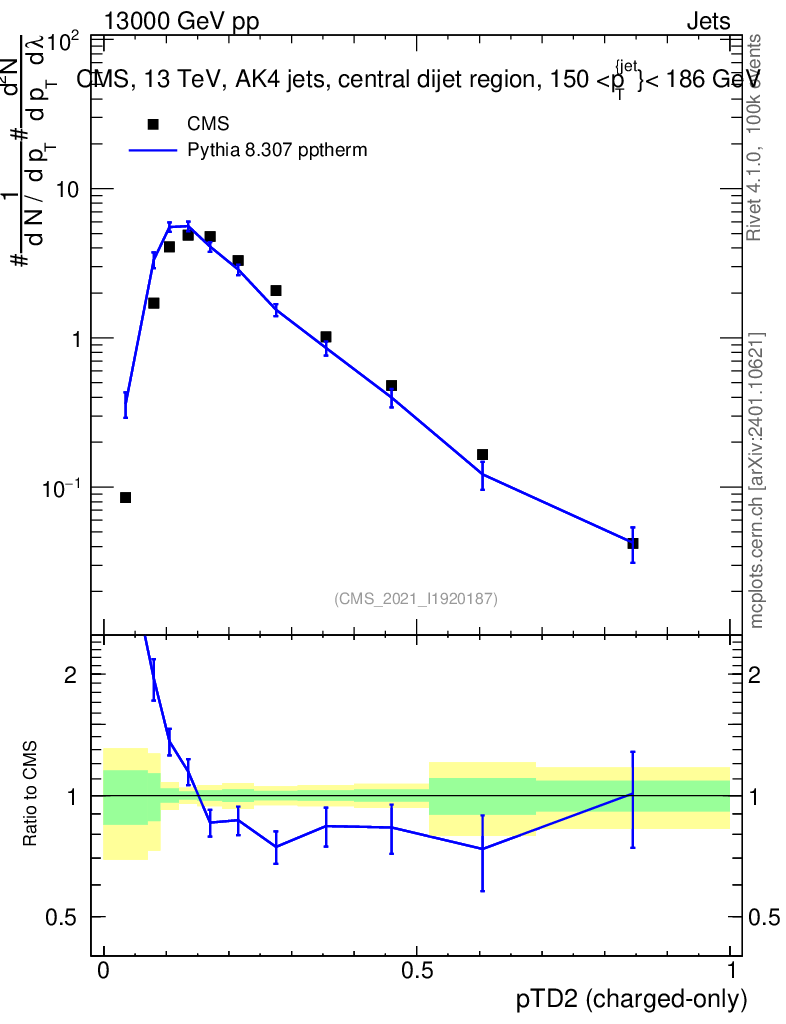 Lines: data, pythia8 8.307 pptherm |