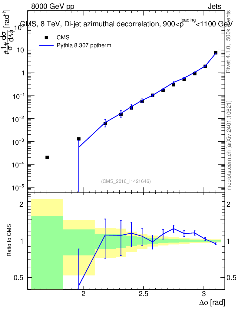 Lines: data, pythia8 8.307 pptherm |