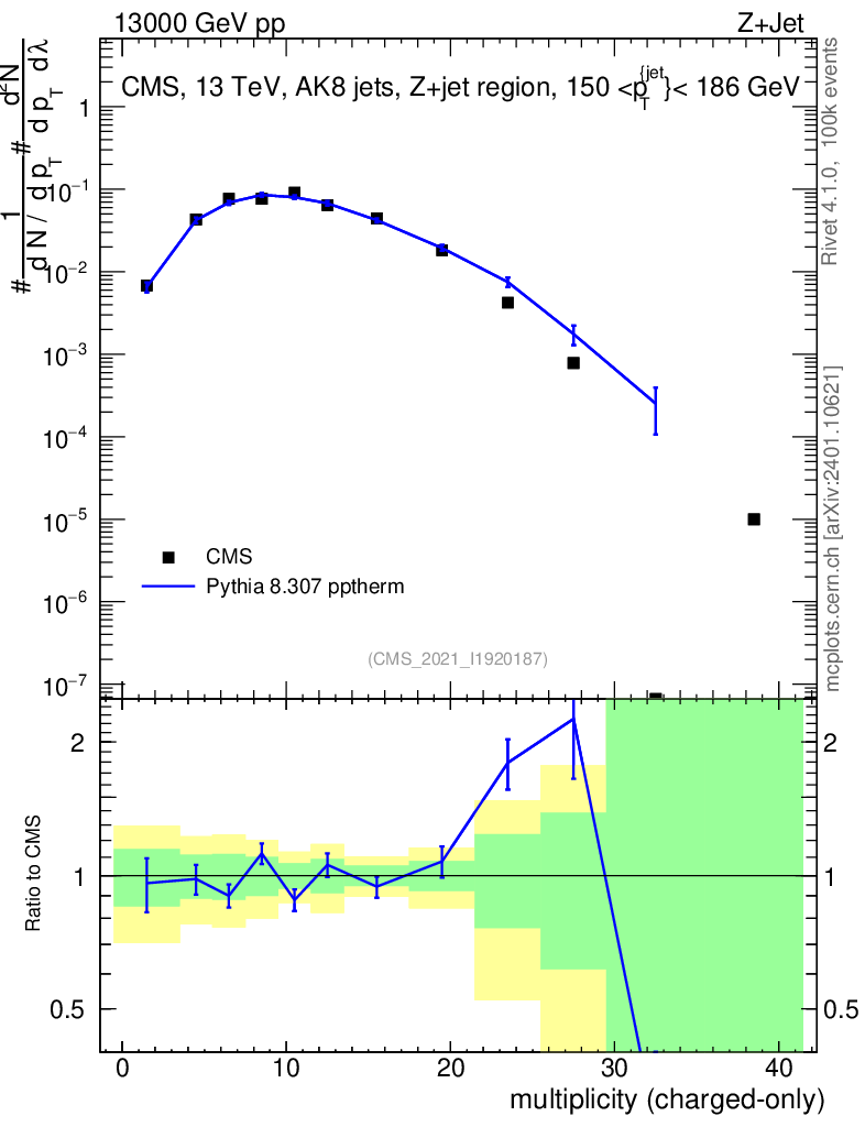 Lines: data, pythia8 8.307 pptherm |