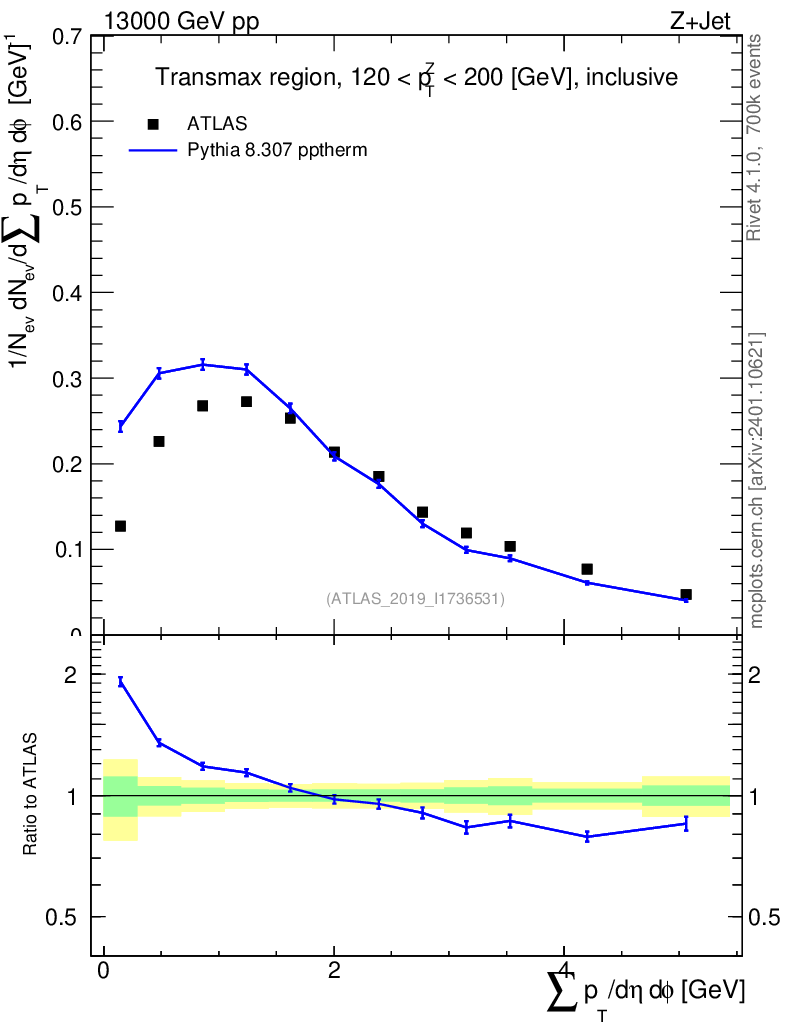 Lines: data, pythia8 8.307 pptherm |