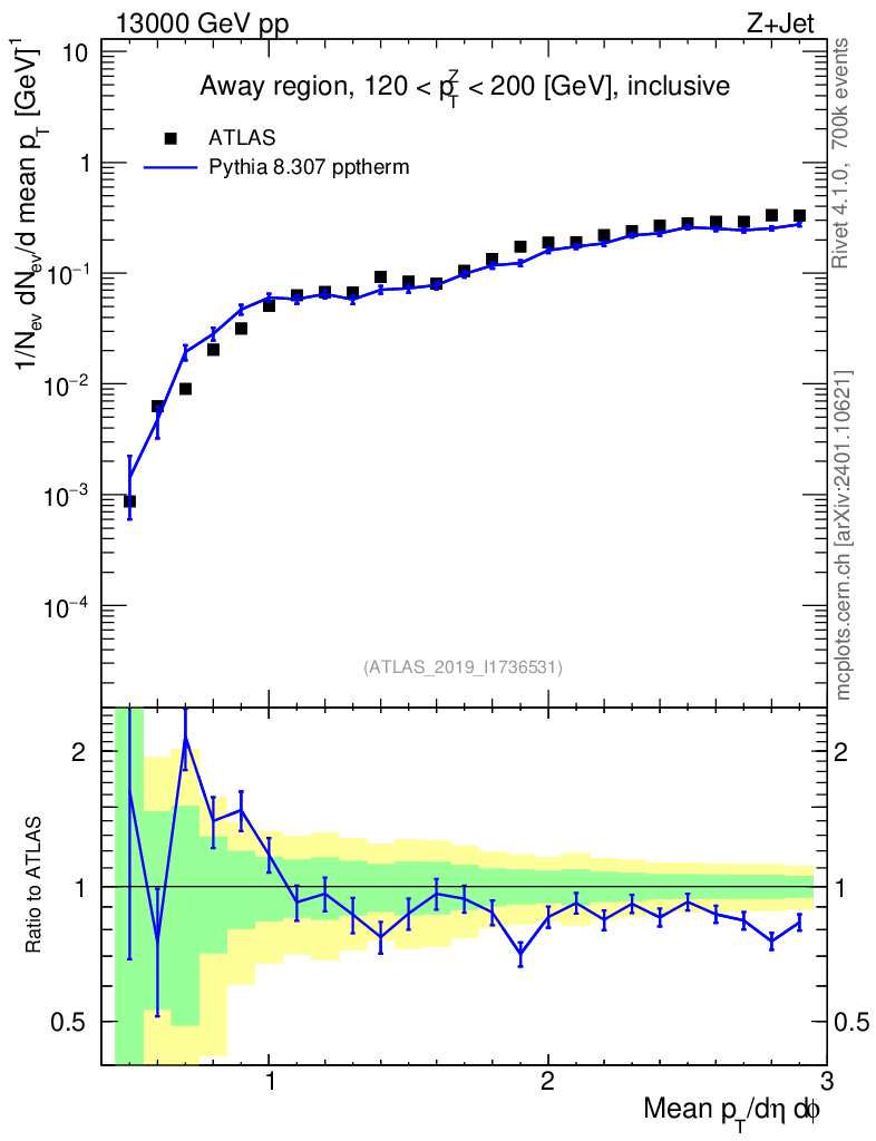 Lines: data, pythia8 8.307 pptherm |