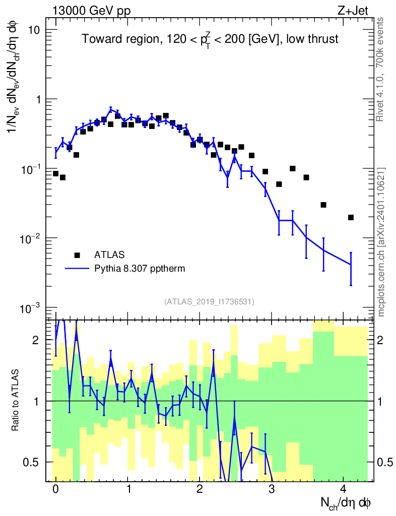 Lines: data, pythia8 8.307 pptherm |
