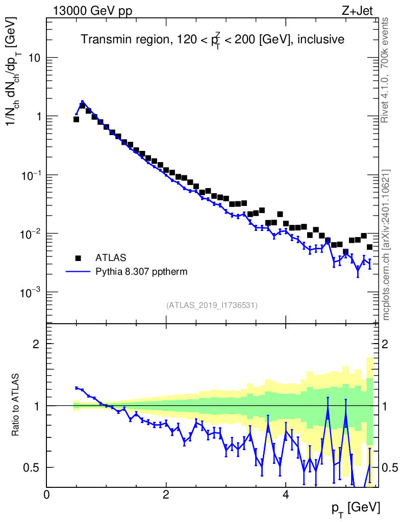 Lines: data, pythia8 8.307 pptherm |