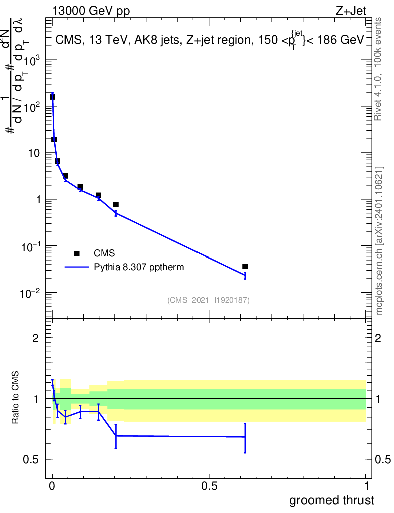 Lines: data, pythia8 8.307 pptherm |