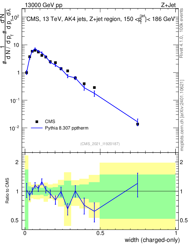 Lines: data, pythia8 8.307 pptherm |