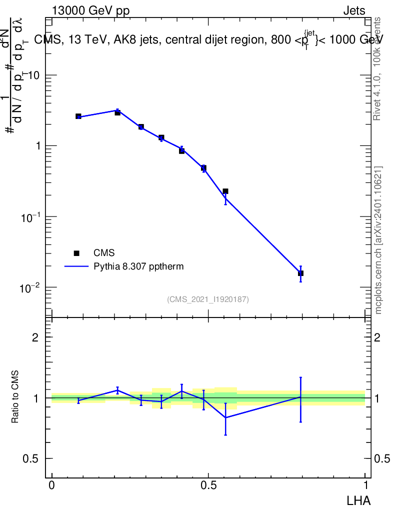 Lines: data, pythia8 8.307 pptherm |