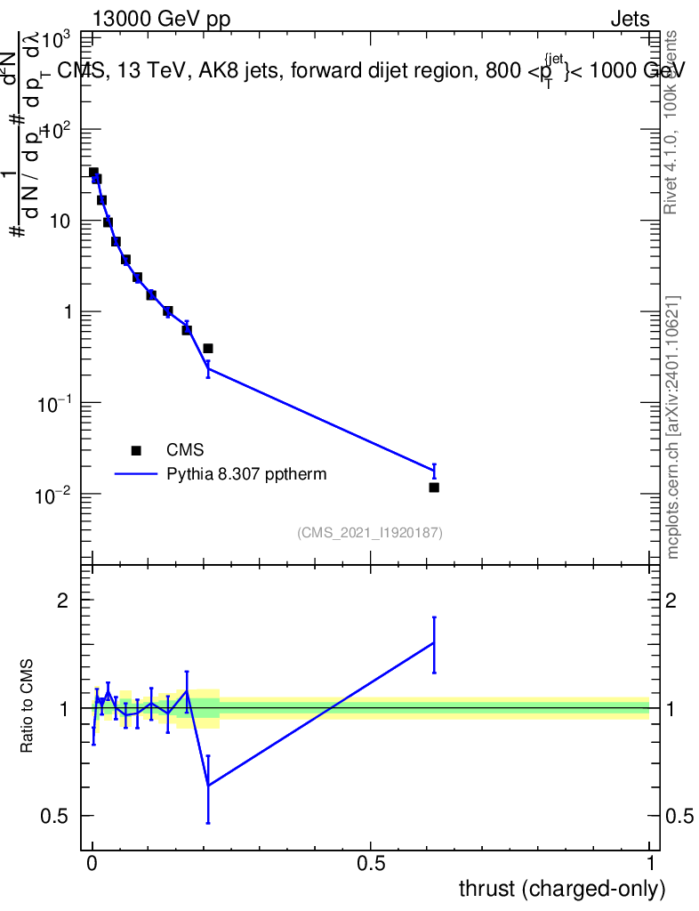 Lines: data, pythia8 8.307 pptherm |
