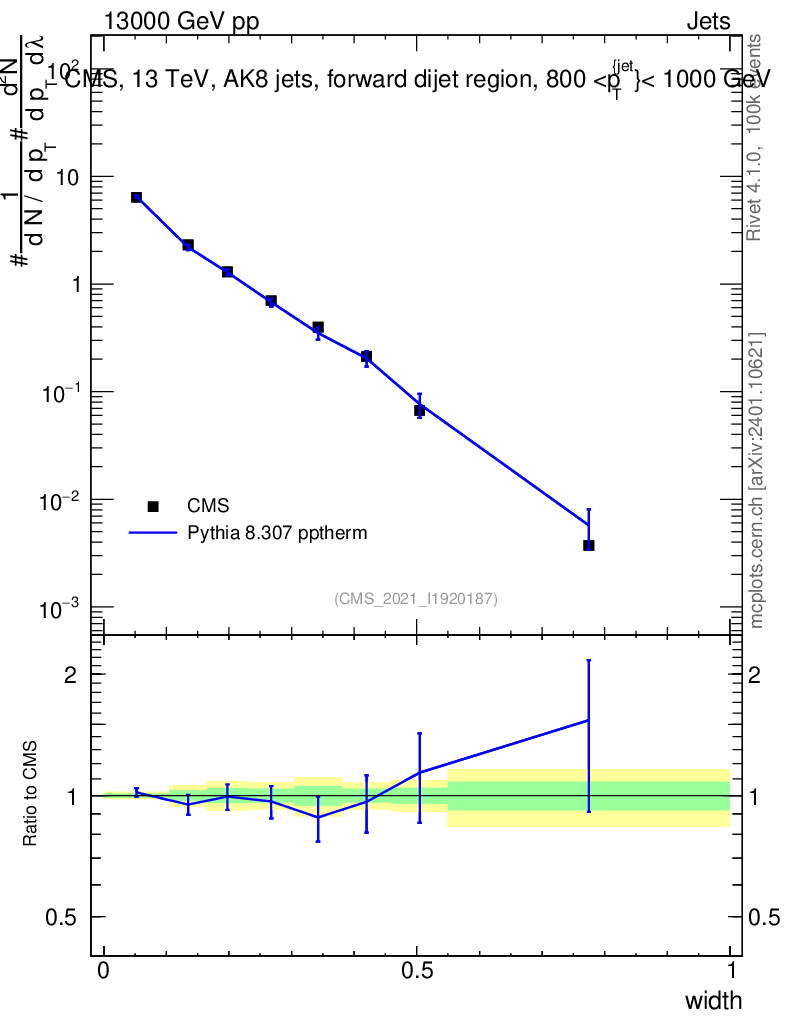 Lines: data, pythia8 8.307 pptherm |