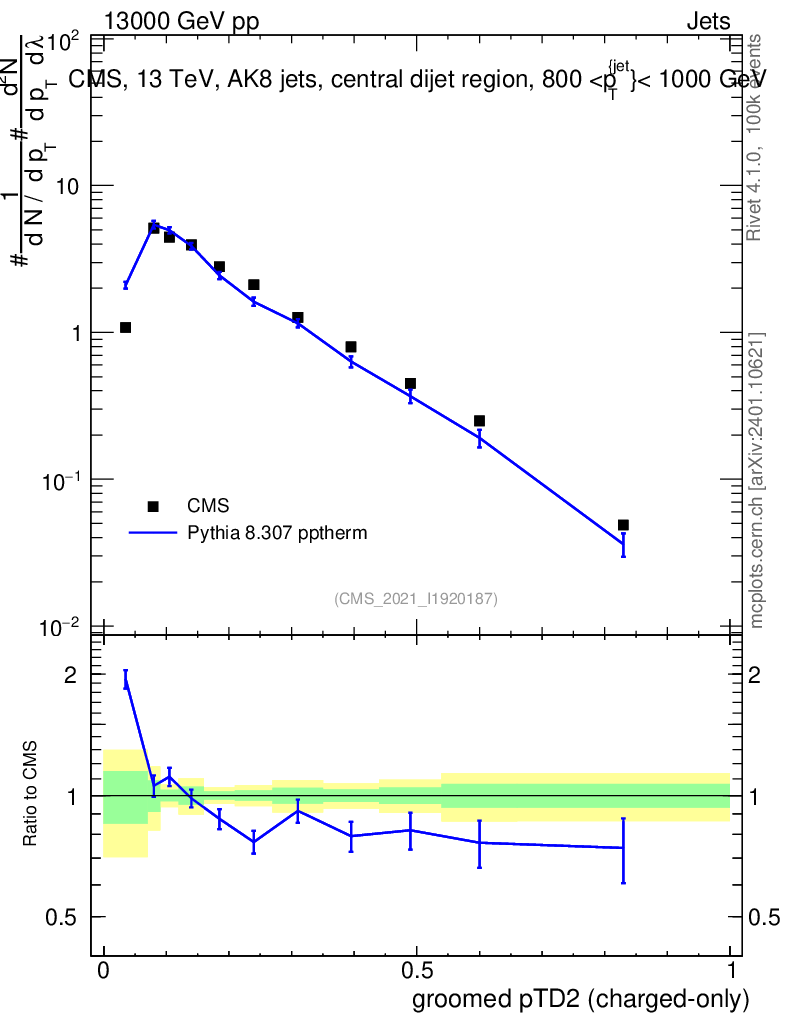 Lines: data, pythia8 8.307 pptherm |