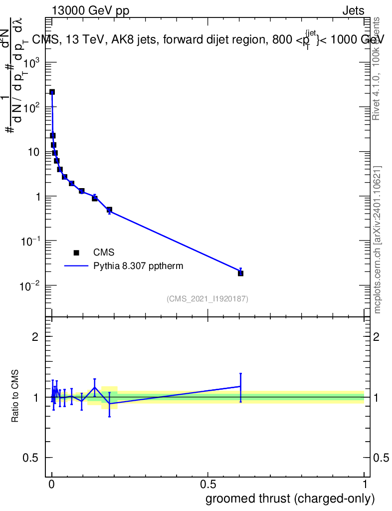 Lines: data, pythia8 8.307 pptherm |