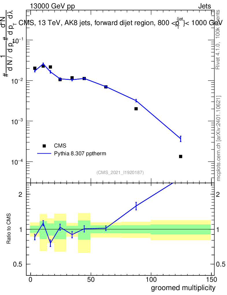 Lines: data, pythia8 8.307 pptherm |