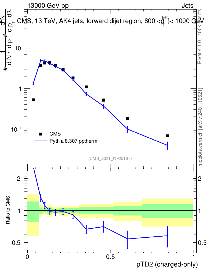 Lines: data, pythia8 8.307 pptherm |