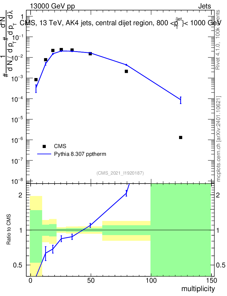 Lines: data, pythia8 8.307 pptherm |