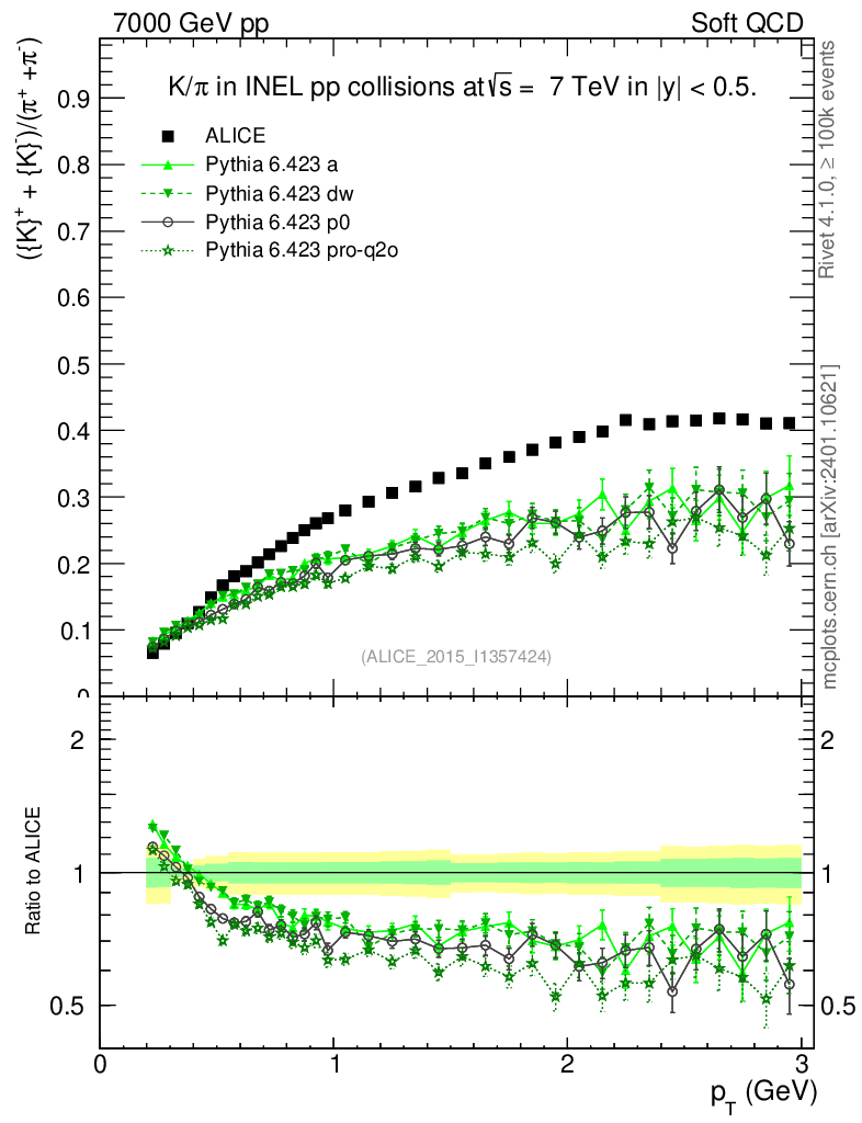 Soft QCD (inelastic) : Identified Particles : Ratios : (K-+K+)/(π-+π+) vs pT