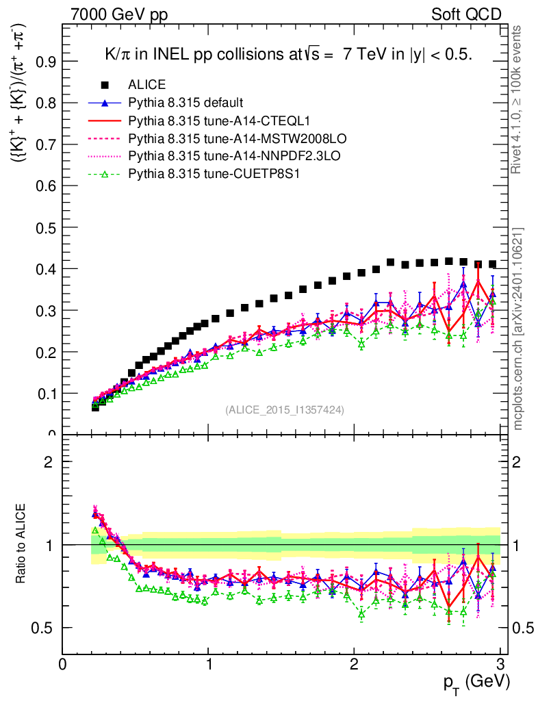 Soft QCD (inelastic) : Identified Particles : Ratios : (K-+K+)/(π-+π+) vs pT