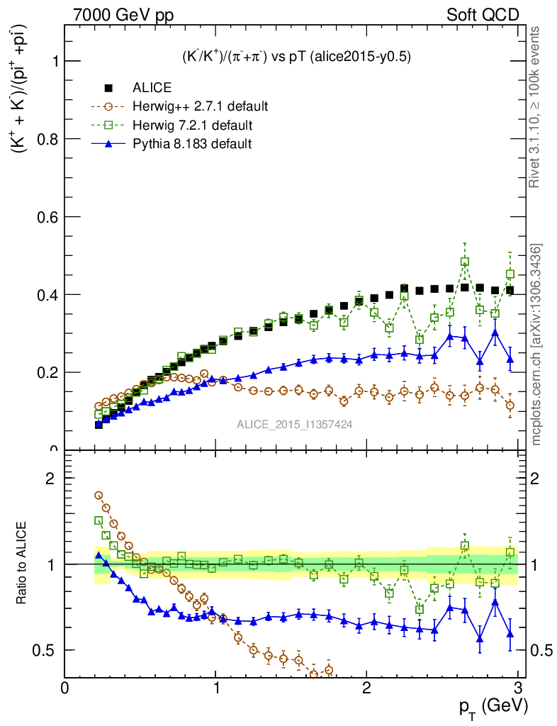 Soft QCD (inelastic) : Identified Particles : Ratios : (K-+K+)/(π-+π+) vs pT